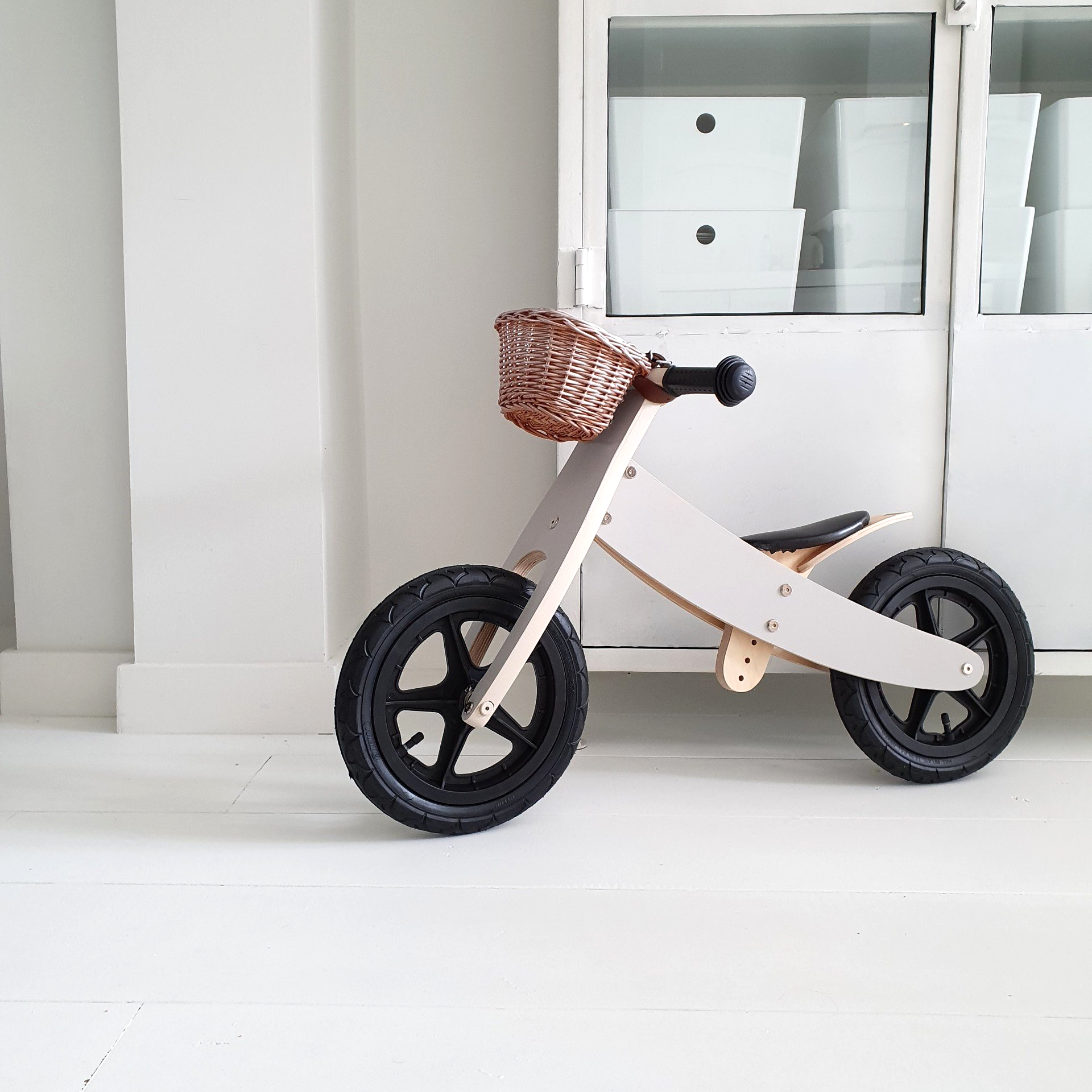 Geverfd met de Chalky Finisch meubelverf Kiezel en Toffee en de rieten fietsmand gespoten in Rose Gold Metalic spray.